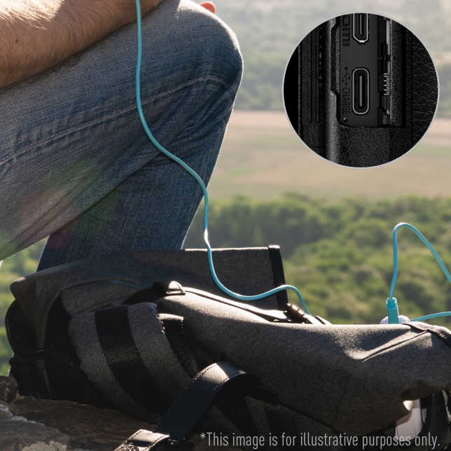 A fényképezőgéphez DMW-BLK22 akkumulátorcsomag tartozik. A fényképezőgépet a kereskedelemben kapható mobil akkumulátorral és Cít-pusú USB kábellel is használhatja, így biztosítva, hogy bárhol is van, mindig használatra kész legyen.*